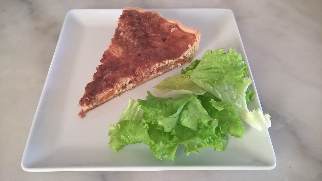 En entrée : 1/8 de tarte, à servir avec une salade verte suivit d’une viande blanche accompagnée de légumes cuits, un yaourt sucré et un fruit.