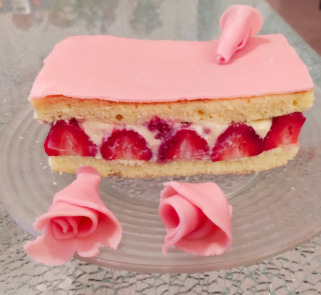 Décorer comme vous le souhaitez : avec des morceaux de fraises ou des fleurs en pâte d’amande.
