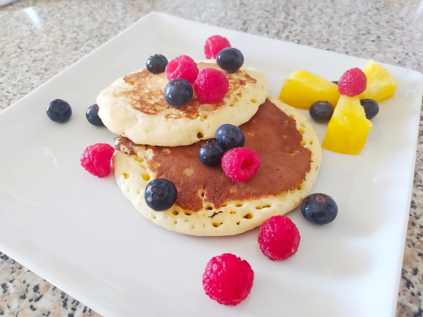 Dans une assiette, déposer 2 pancakes et quelques myrtilles, framboises et un peu d’ananas.
