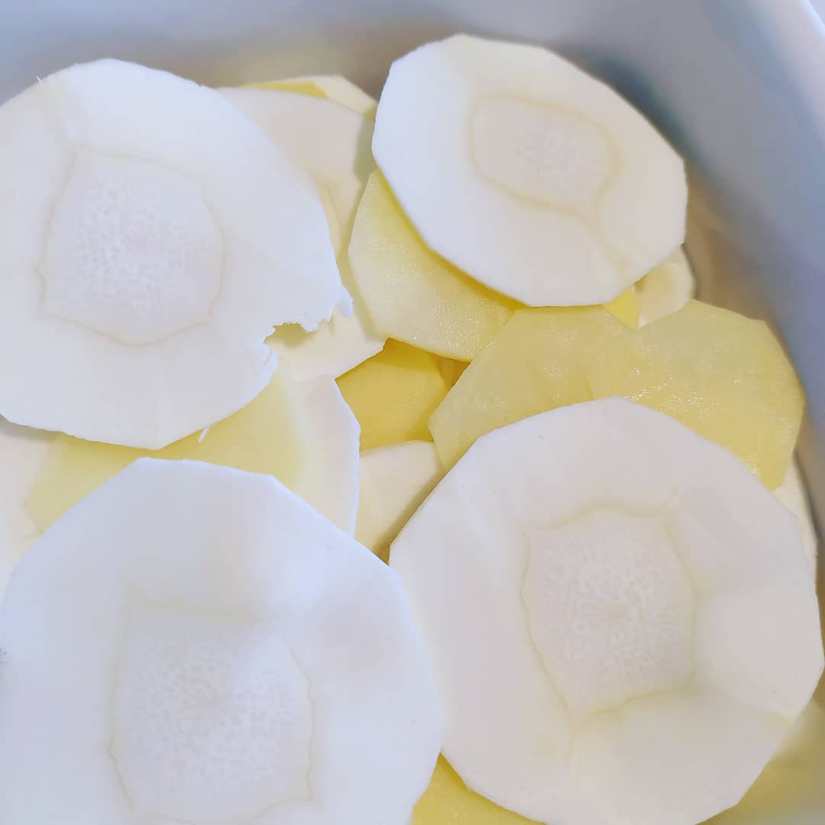 Laver, éplucher les pommes de terre et les panais. Découper en lamelles.