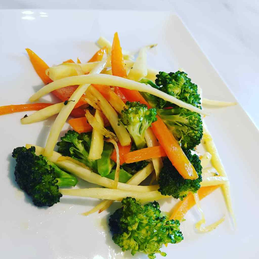 Tailler les carottes et les panais en juliennes (petit bâtonnets), émincer l’oignon et détailler de petits bouquets de brocoli.