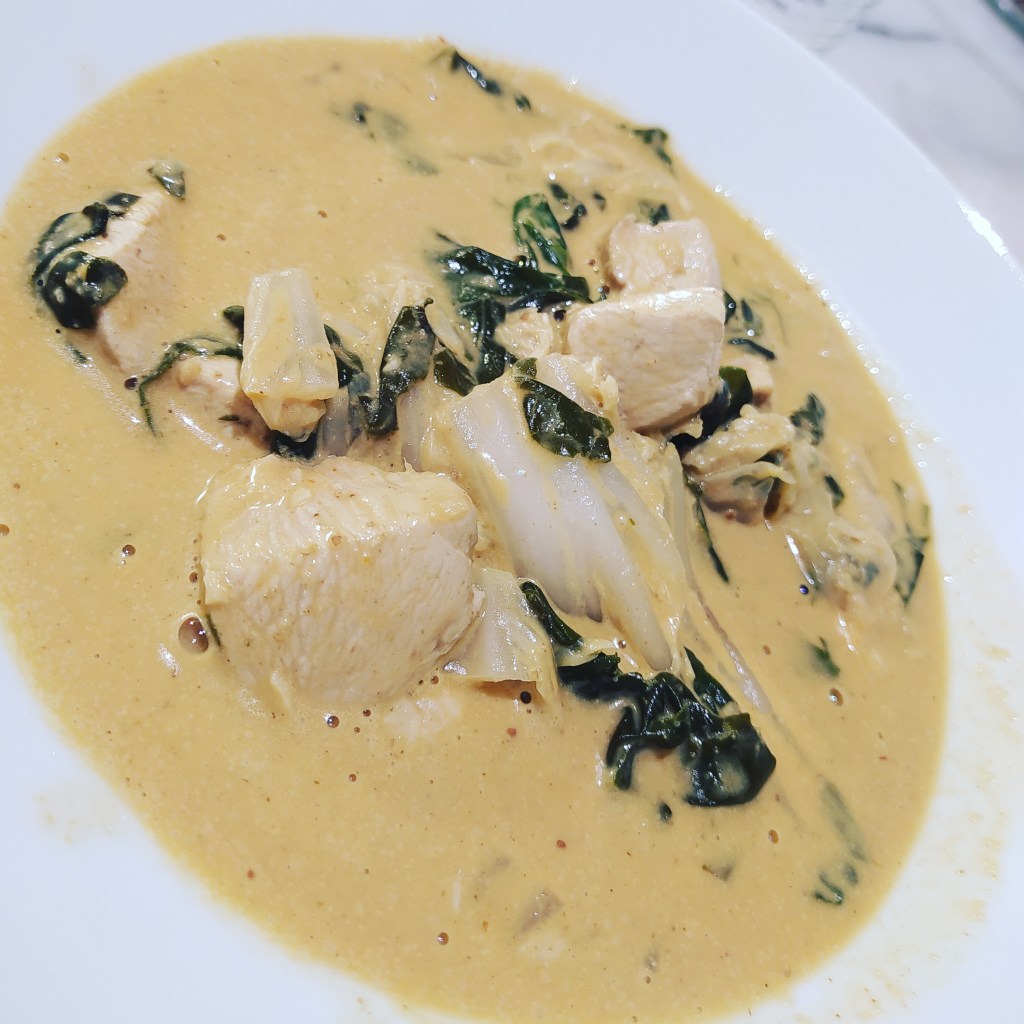Quand il est chaud mais non bouillant, délayer la pâte de curry rouge.