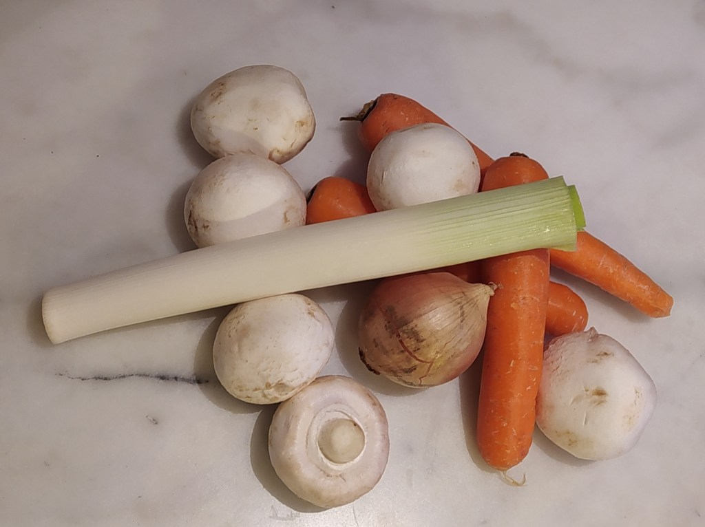 Laver les légumes. Éplucher et découper en rondelles les carottes. Émincer les poireaux et l’oignon. Découper en lamelles les champignons.