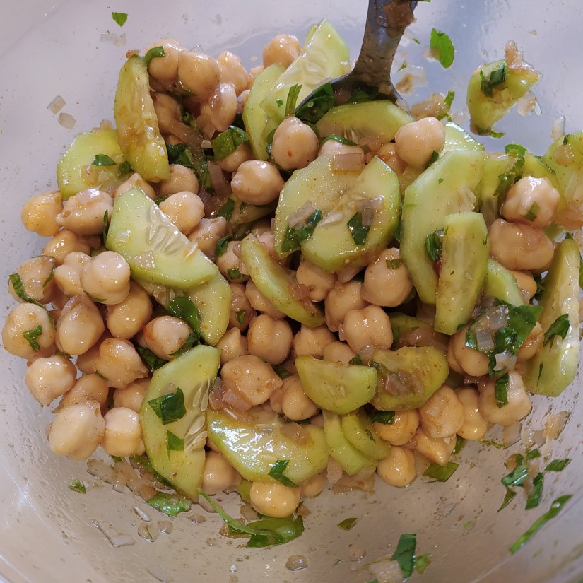 Mélanger dans le saladier, le concombre, les pois chiches, la menthe, la roquette, les pickles d’échalotes.